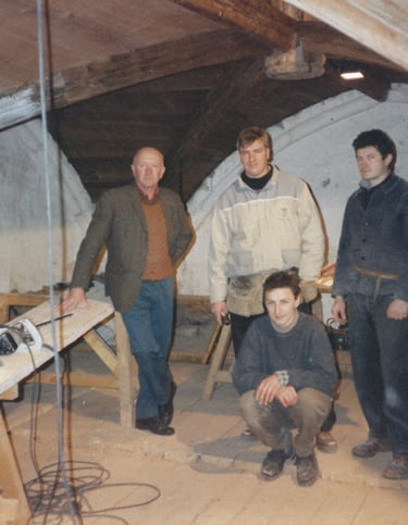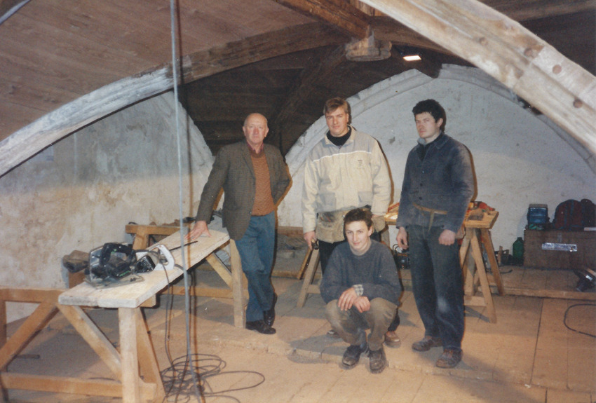 Under the watchful eye of the mayor of the commune – himself a carpenter by trade – three journeymen from the Tour de France guild work on the curved and moulded timber, handling the resin to restore the vaults. Jean-Marc Lacoste, Jean-Marc Delamotte, Joël Caillet and Nicolas, a young apprentice, work with passion and dexterity.